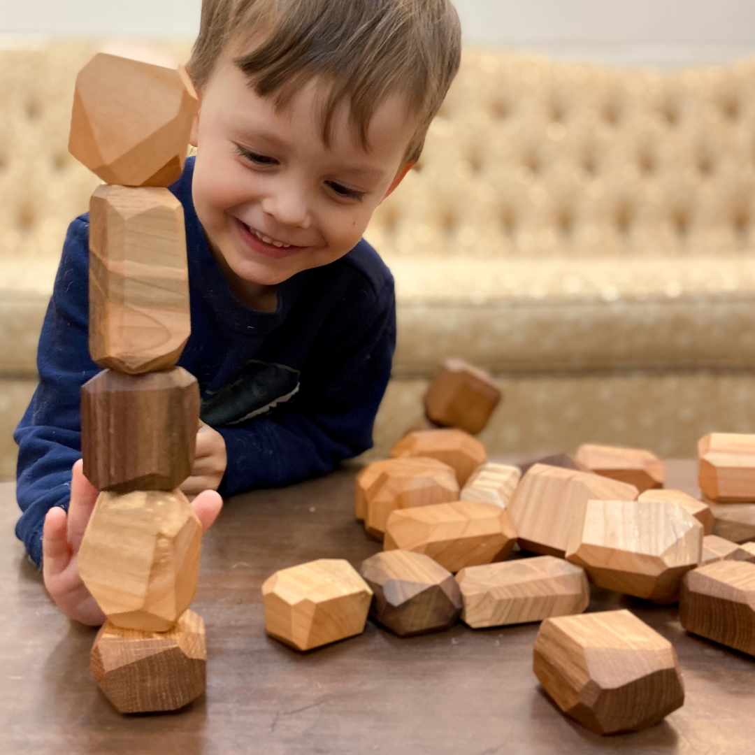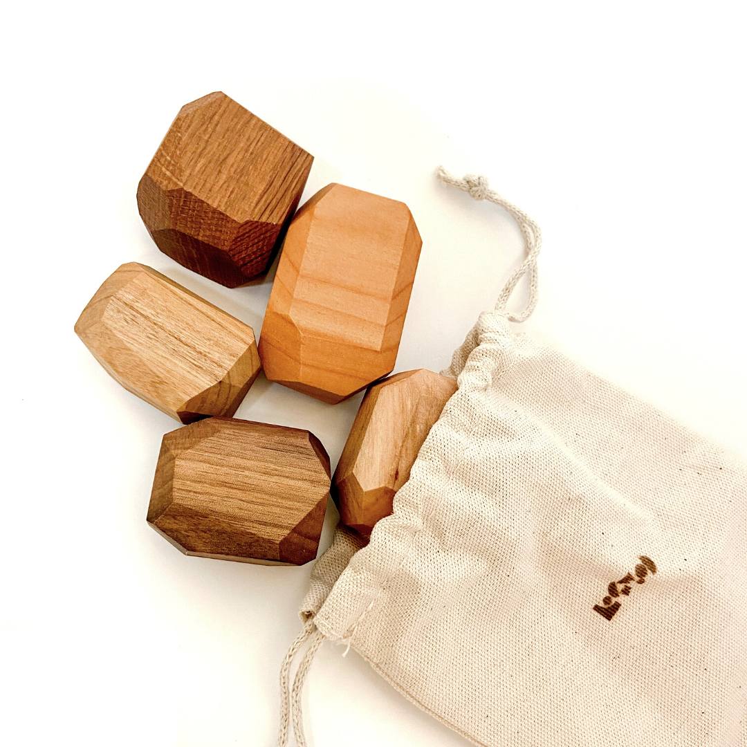 Level-up your building blocks! These geometric wood blocks can be stacked multiple ways. Whether they're used as a fidget toy on your office desk or an avalanche of boulders for kiddos' small world play, these wooden gems add natural whimsy to any environment.